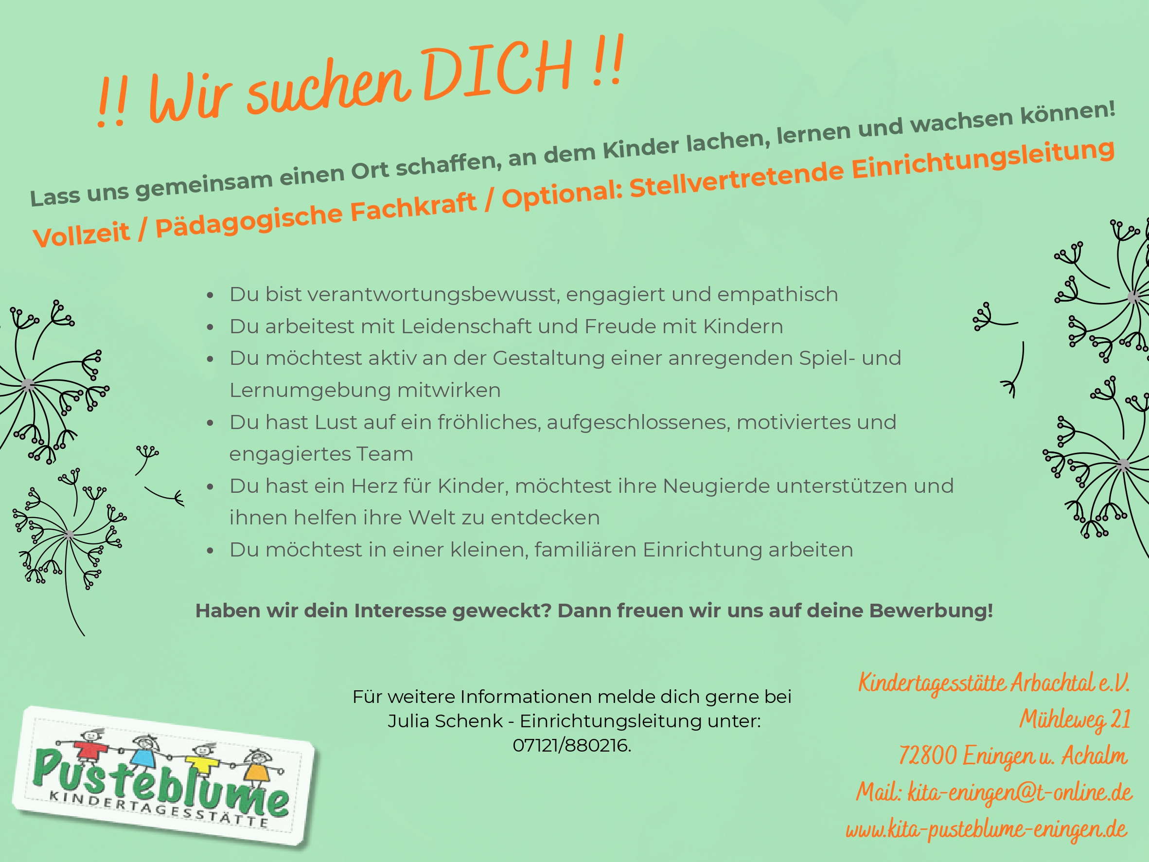 Der Verein „Kindertagesstätte Arbachtal e.V.“ in Eningen unter Achalm, Landkreis Reutlingen, sucht für seine zweigruppige Kindertagesstätte ab sofort: